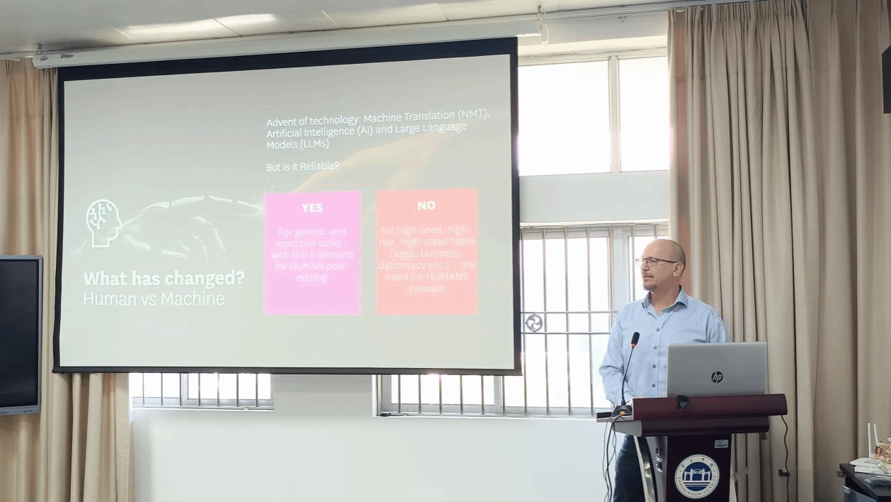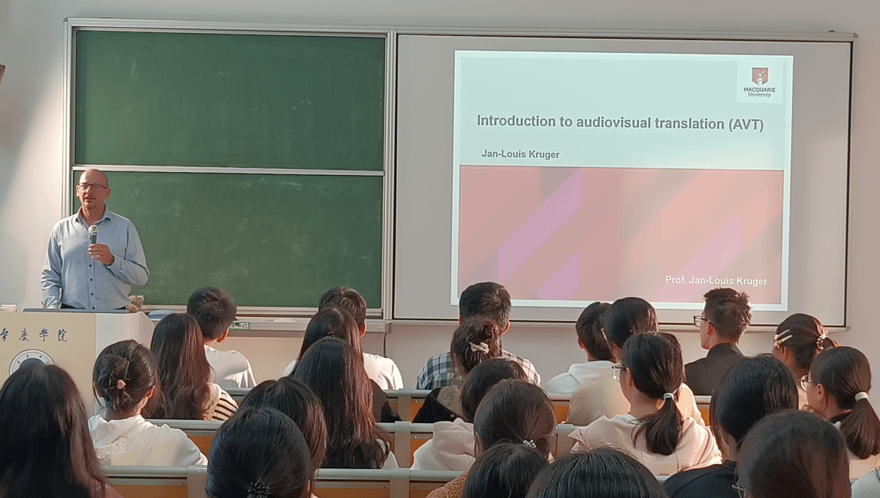 随后Kruger教授为我校国际班学生带来了一场题为“视听翻译导论”的专题讲座。他系统梳理了视听翻译的理论框架,并探讨了在人工智能席卷全球的背景下,视听翻译的发展与所面临的挑战。