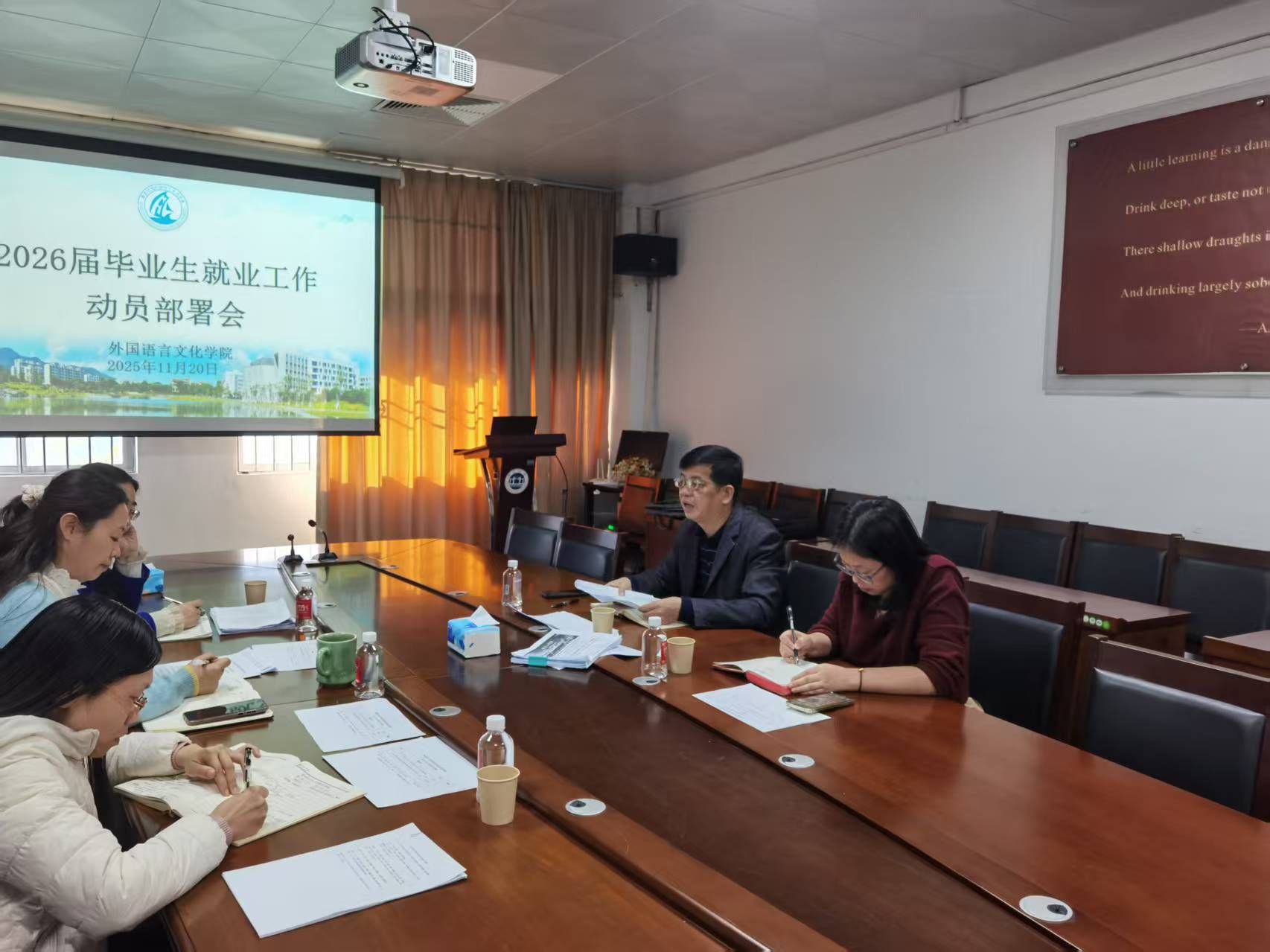 为深入贯彻落实国家关于高校毕业生就业工作的决策部署,精准推进就业指导服务。11月20日、26日,外国语言文化学院先后召开2026届毕业生就业工作部署会与就业推进会。学院党委书记卢咏、主持行政全面工作副院长于增辉、党委副书记杨琼、副院长李春明、副院长郭美华、全体辅导员和毕业班班主任参加。会议由卢咏主持。