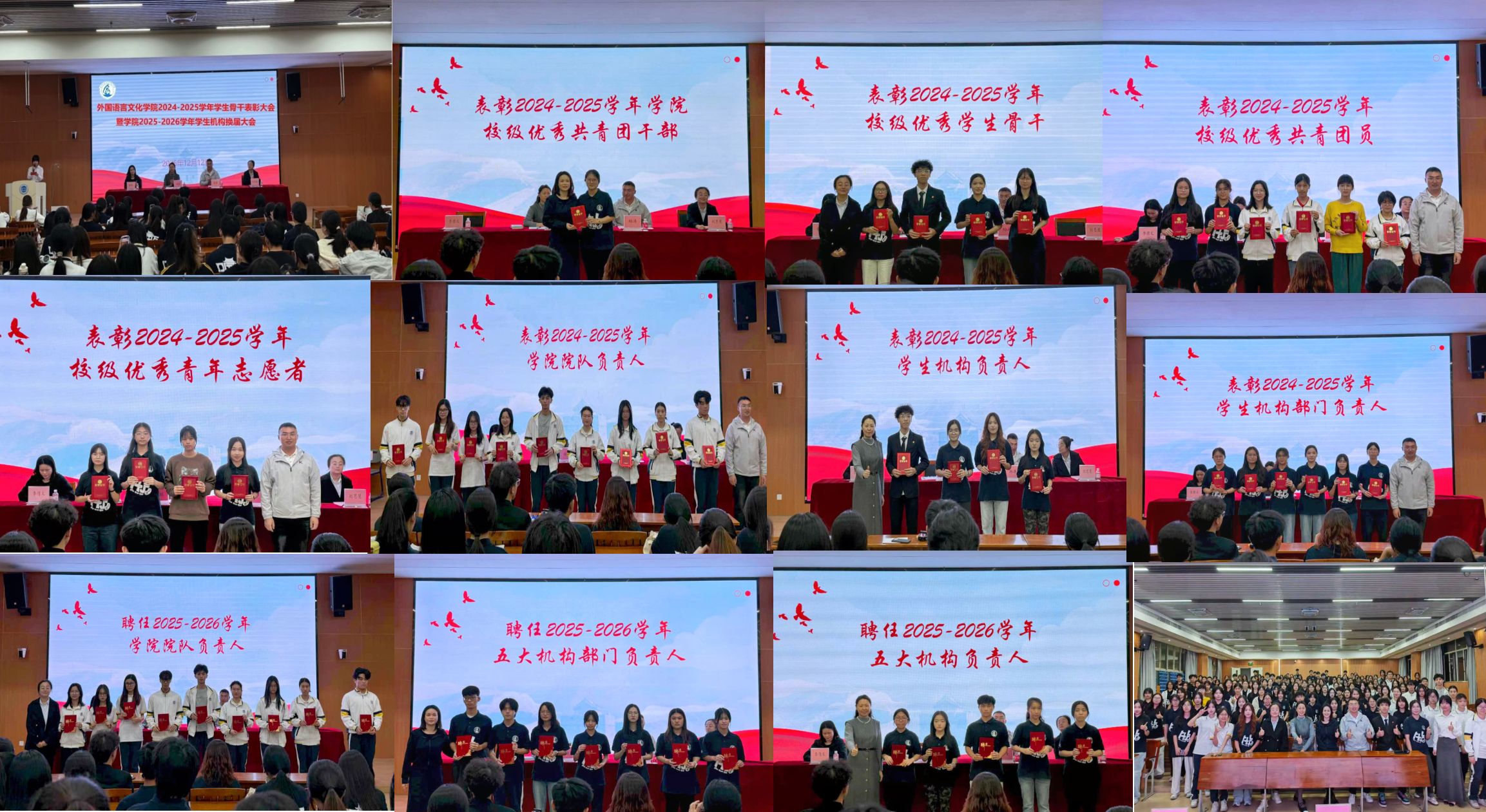 12月12日晚,外国语言文化学院2024-2025学年学生骨干表彰大会暨学院2025-2026学年学生机构换届大会在二教704教室举行。学院党委副书记杨琼、团委书记杨涛、辅导员李倩文、辅导员刘思慧、学院五大学生机构骨干、11支院队骨干代表以及上一学年获得校级优秀共青团干部、优秀共青团员、优秀学生骨干和优秀青年志愿者的同学共计200余人参加本次会议。大会由院司仪队罗喜儿主持。