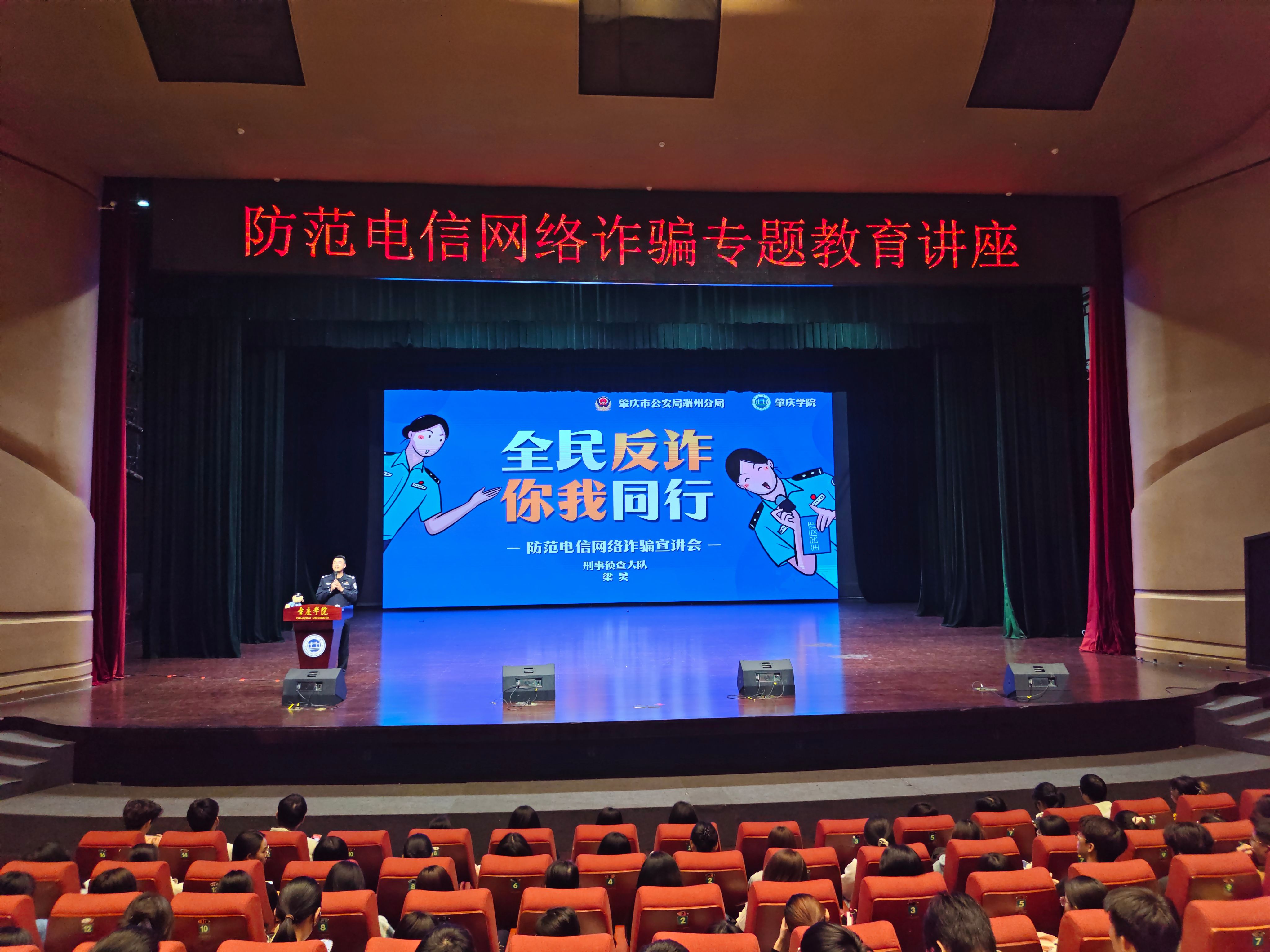 为进一步筑牢校园反诈防线,切实增强我院学生识骗、防骗能力,12月10日下午,外国语言文化学院联合端州区公安分局在学校艺术中心举办“防范电信网络诈骗”专题教育讲座。端州区公安分局刑侦大队梁炅警官应邀担任主讲,2024级、2025级全体学生共700多人参加。