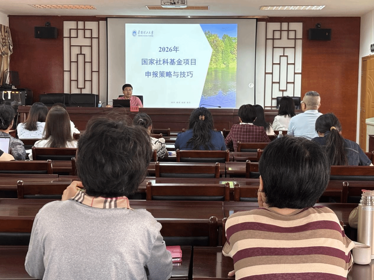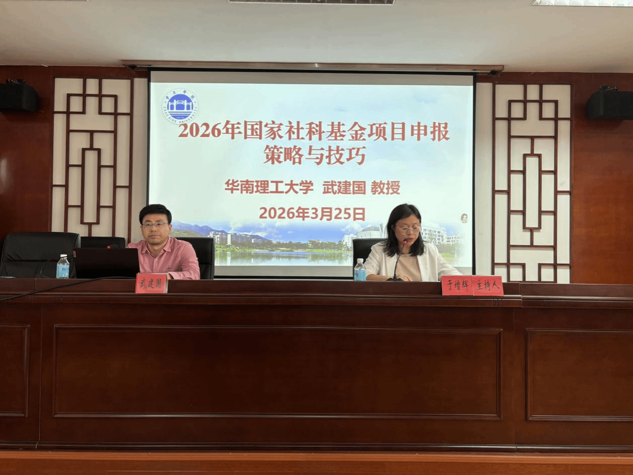 3月25日,外国语言文化学院在文笔峰二楼学术报告厅举办2026年国家社科基金项目申报策略与技巧讲座。学院有幸邀请到华南理工大学外国语学院副院长武建国教授担任主讲嘉宾,主持行政全面工作副院长于增辉主持讲座。