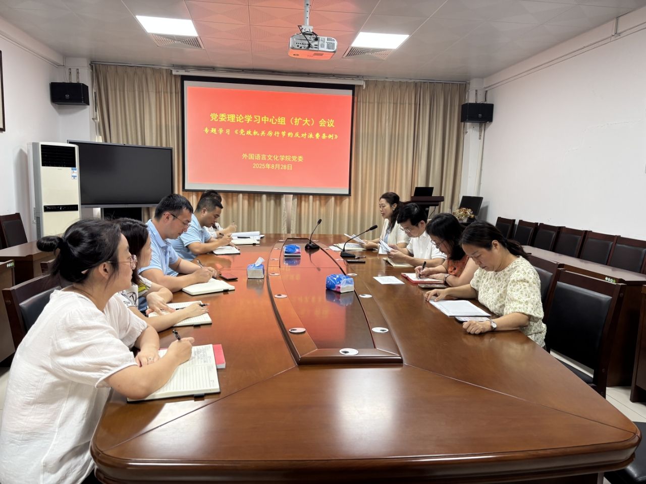 8月28日,外国语言文化学院党委理论学习中心组(扩大)会议召开,专题学习《党政机关厉行节约反对浪费条例》(以下简称《条例》),学院党委理论学习中心组成员、党支部书记参加,党委书记卢咏主持,党委副书记杨琼领学。