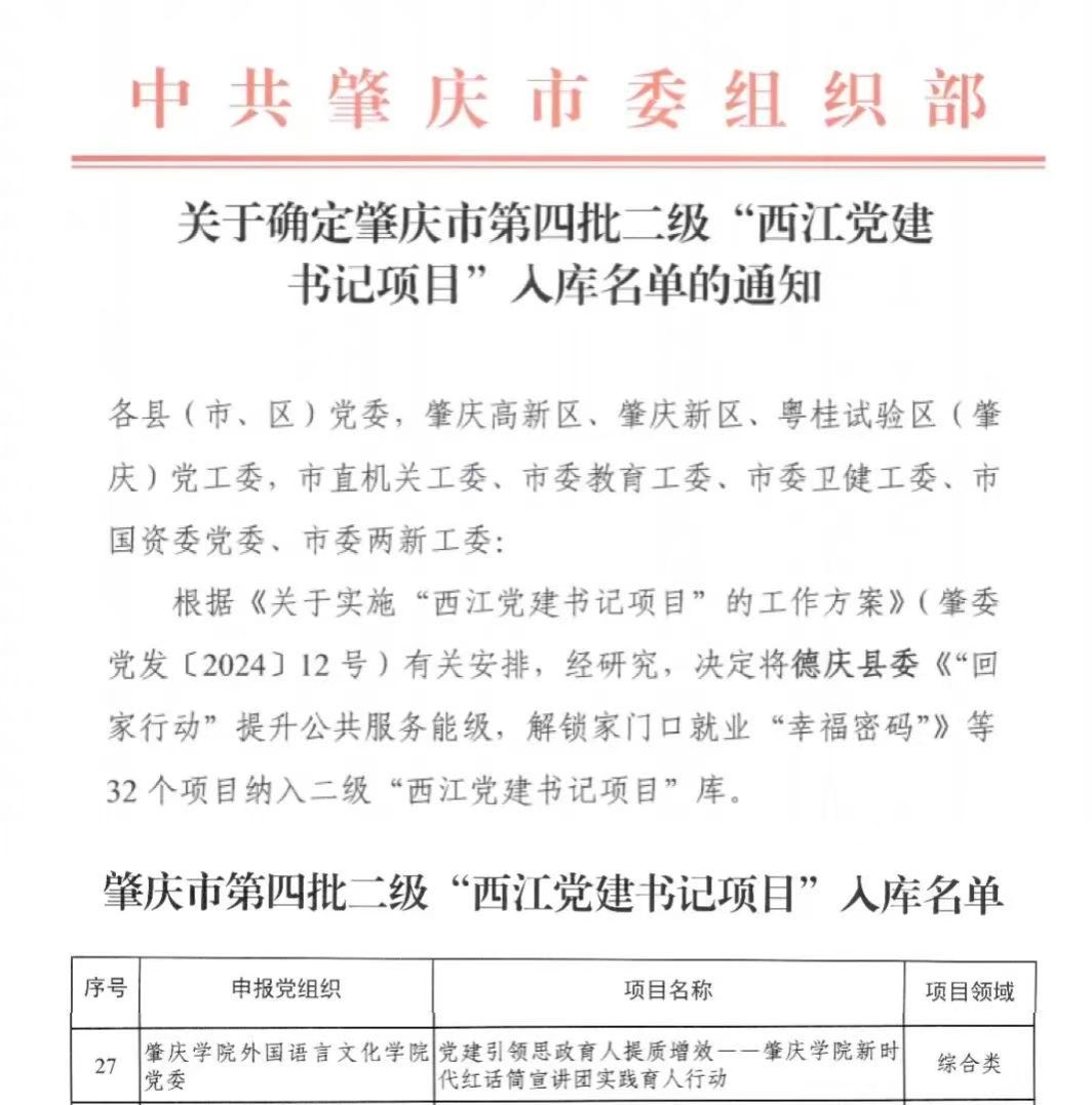 本网讯 近日,肇庆市委组织部公布了第四批二级“西江党建书记项目”入库名单,学院党委的党建项目《党建引领思政育人提质增效——肇庆学院新时代红话筒宣讲团实践育人行动》成功入选。该项目是继我校《砚园先锋计划:组织员素质提升体系构建》后第二个“西江党建书记项目”,体现了学院党建赋能不断取得新成效。