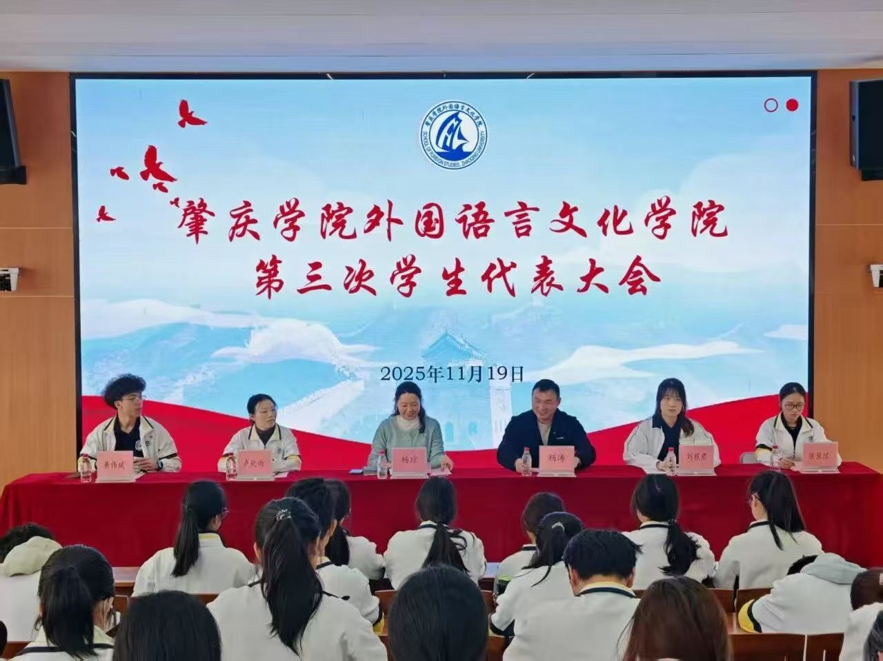 2025年11月19日中午,肇庆学院外国语言文化学院第三次学生代表大会在第二教学楼704教室隆重召开。肇庆学院外国语言文化学院党委副书记杨琼老师、学院团委书记杨涛老师、校学生会主席团成员卢欣雨同学、院学生会主席团成员黄伟斌、陈慧琪、刘根君以及学院五大机构代表和各班级的学生代表等70余人参加了本次会议。 会议由院学生会主席团成员黄伟斌同学主持。